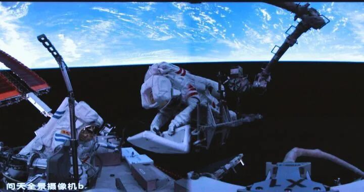 這是2025年6月26日在北京航天飛行控制中心屏幕上拍攝的神舟二十號(hào)航天員陳冬(左)與陳中瑞在空間站組合體艙外工作的畫面。新華社發(fā)(周柯毅 攝)